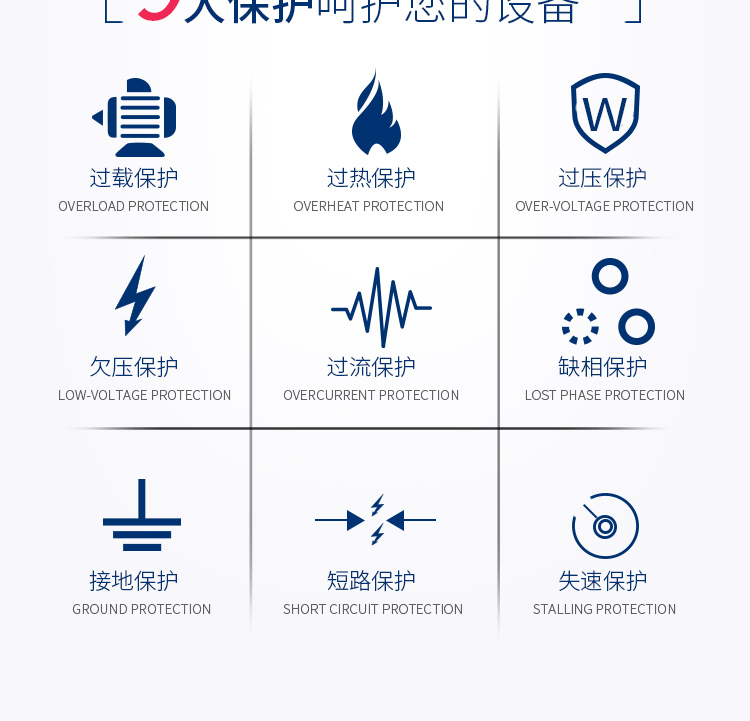 提供多種故障保護(hù)功能:過(guò)流、過(guò)壓、欠壓、過(guò)溫、缺相、過(guò)載等保護(hù)功能