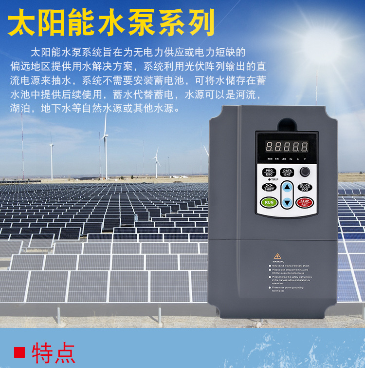 SK650系列變頻器是三科推出的針對(duì)光伏發(fā)電,驅(qū)動(dòng)三相交流水泵的變頻器,它采用大功率點(diǎn)追蹤及久經(jīng)考驗(yàn)的電機(jī)驅(qū)動(dòng)技術(shù)以催化增大太陽(yáng)能模塊的輸出功率,它將直流電直接逆變成三相交流電,可驅(qū)動(dòng)各類(lèi)交流水泵。同時(shí)它支持直流和交流輸入,當(dāng)沒(méi)有太陽(yáng)能時(shí),該變頻器手動(dòng)切換到單項(xiàng)或三相交流電輸入,如市電發(fā)電機(jī)或電池。SK650光伏水泵變頻器提供全方位保護(hù),電機(jī)軟啟動(dòng)及調(diào)速功能,即開(kāi)即用,安裝方便。| 產(chǎn)品型號(hào) | SKI650A075G-090G-4 | SKI650A090G-110G-4 | SKI650A110G-132G-4 |