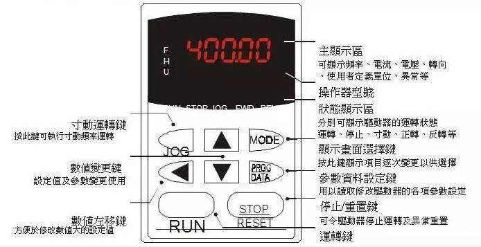 4.熟悉變頻器的操作鍵。如圖