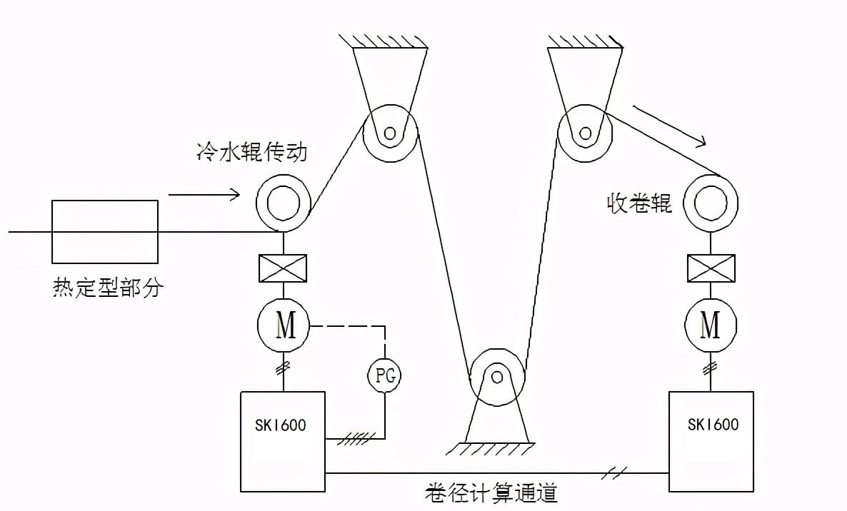 熱定型機(jī)卷取機(jī)前級(jí)為冷水輥,采用三分支SKI80高性能矢量控制變頻器和恒速控制。電機(jī)配有編碼器,編碼器利用冷水輥驅(qū)動(dòng)器的速度反饋進(jìn)行閉環(huán)控制。由卷繞控制的織物線速度由冷水輥?zhàn)冾l器的模擬輸出端口提供。卷筒空時(shí)直徑約200mm,滿時(shí)約1400mm,纏繞直徑變化7倍以上。在整個(gè)卷繞過(guò)程中,隨著卷繞直徑的增加,需要向卷繞電機(jī)提供更多的扭矩。卷筒采用三分支SKI600通用重型專用變頻器,中間安裝張力檢測(cè)輥?zhàn)鳛閿嗑€信號(hào)。